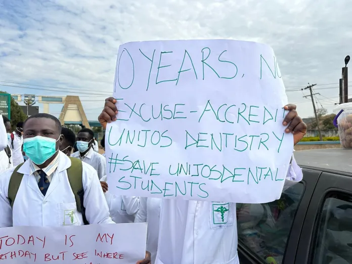 Academic and sporting activities at the University of Jos were disrupted on Wednesday as students of the Faculty of Dentistry staged a massive protest over the institution’s alleged failure to secure accreditation for their programme — a setback that has kept some of them in school for more than a decade without graduation.